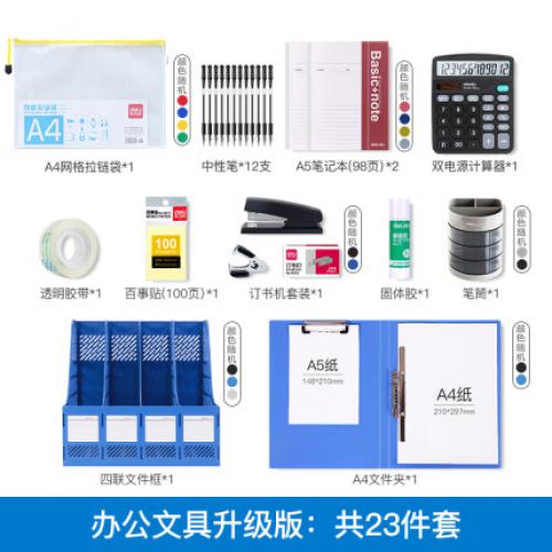 - 颜色分类: 办公文具升级款(23件套) 财会必备套装(31件套) 办公文具套装A(老板、领导适用) 开业大礼包-办公文具一站购(108件套) 基础办公套装 得力9667办公套装