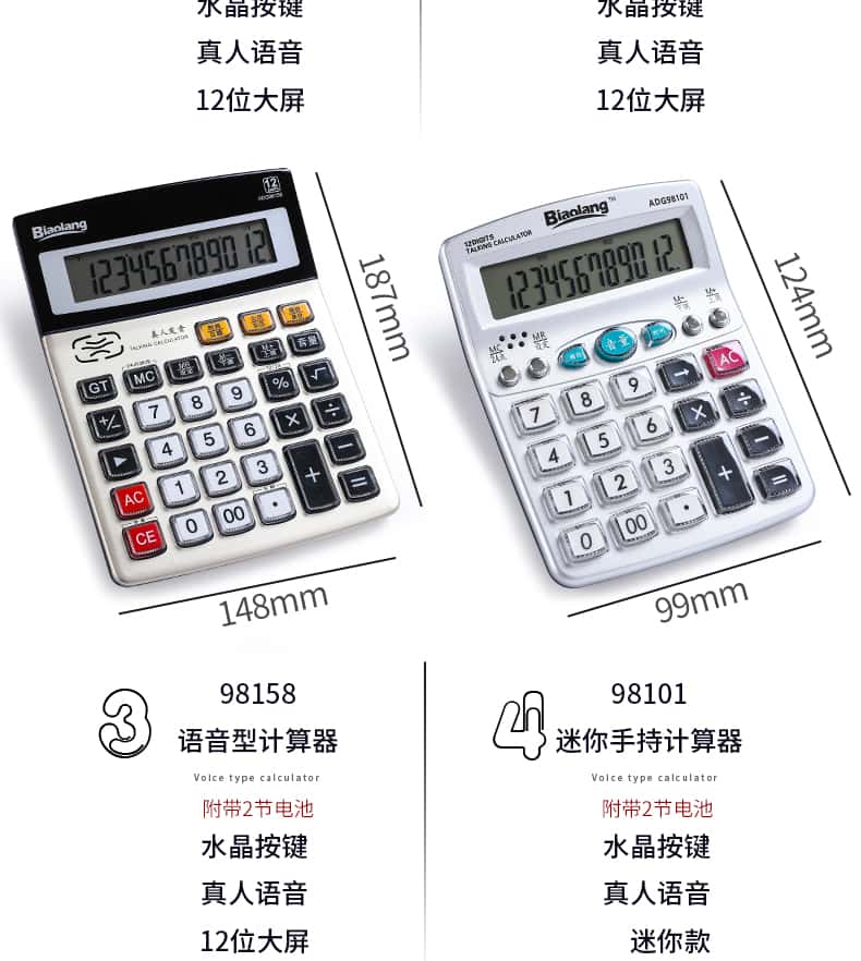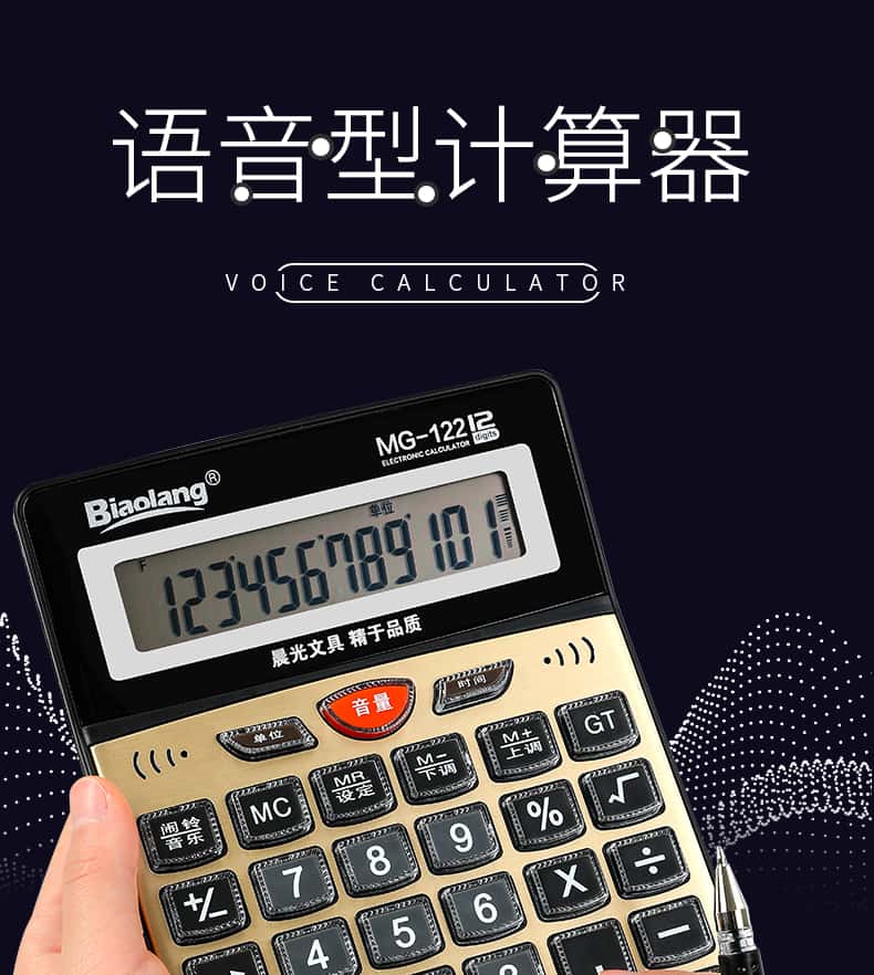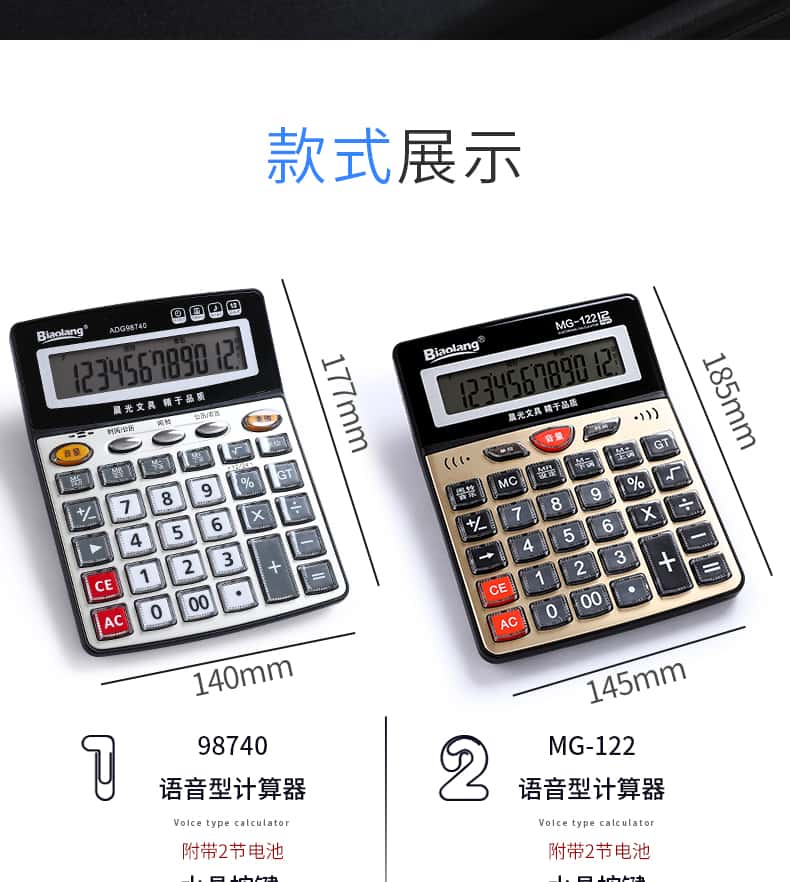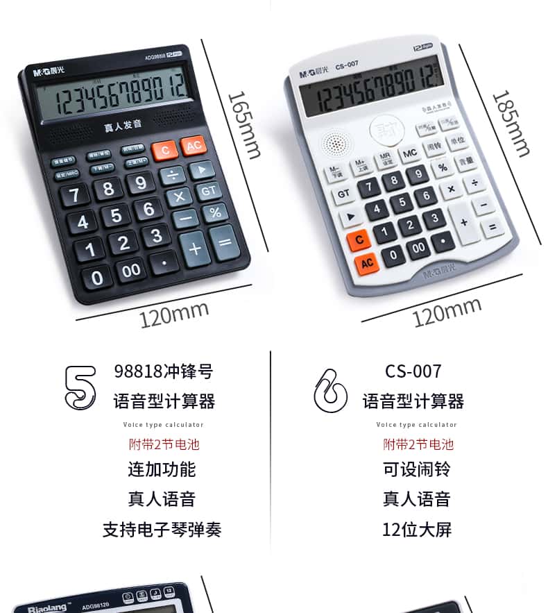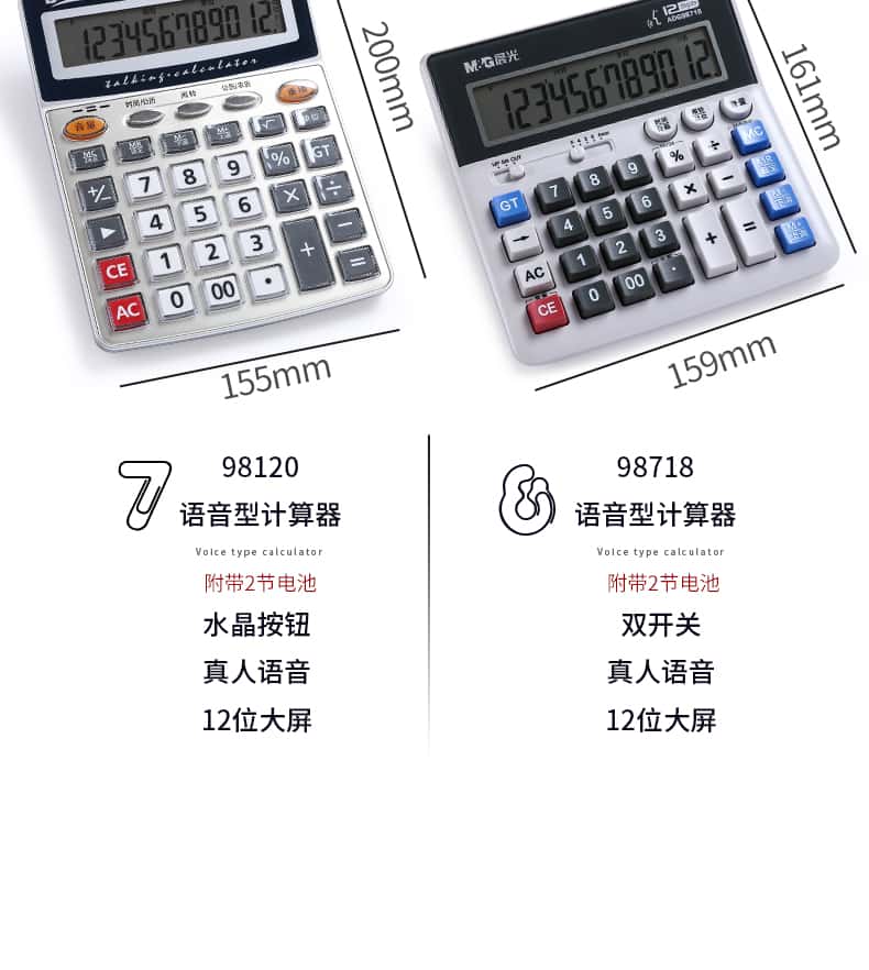 - 颜色分类: 【性价比之王】经典双电源/无语音(送电池+笔) 【两台更优惠】经典双电源/无语音(送电池+笔) 【升级语音款】98838语音款/塑料按键(送电池+笔) 【晨光冲锋号】98818语音款/塑料按键(送电池+笔) 【经济适用型】98104语音款/水晶按键(送电池+笔) 【掌柜推荐款】98740语音款/水晶按键(送电池+笔) 【招财土豪金】MG-122语音款/水晶按键(送电池+笔) 【大大大大号】98120语音款/水晶按键(送电池+笔) 【电脑按键款】98133双电源/无语音(送电池+笔) 【财务专用款】98718语音款/电脑按键(送电池+笔)