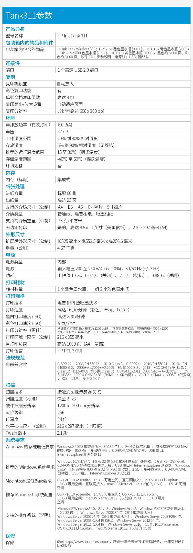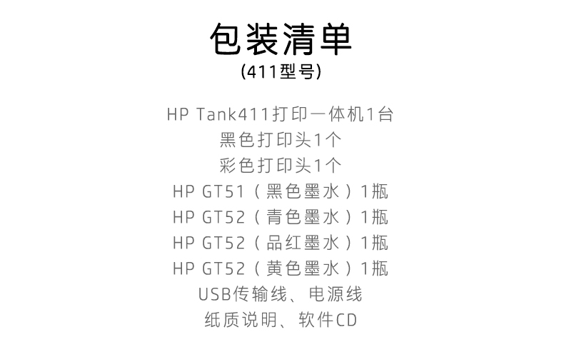 - 颜色分类: tank118(USB连接电脑,无复印扫描功能) tank311(USB连接电脑,不支持无线) tank411(支持无线手机打印)