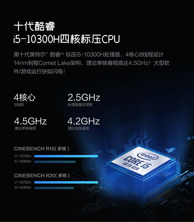 第十代英特尔® 酷睿 ™ i5-10300H 标压处理器,四核八线程,